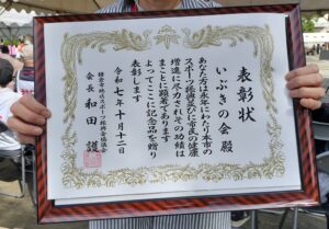 開会式冒頭に、スポーツ功労者表彰状がいぶきの会の長年の健康増進活動にたいして、授与されました。